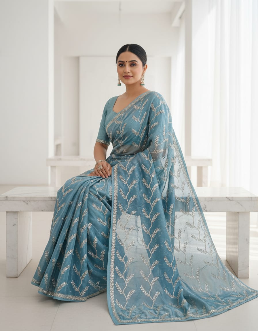 Be the first to review “Fandy chiffon fabric saree with fancy heavy jarkan full work saree”
