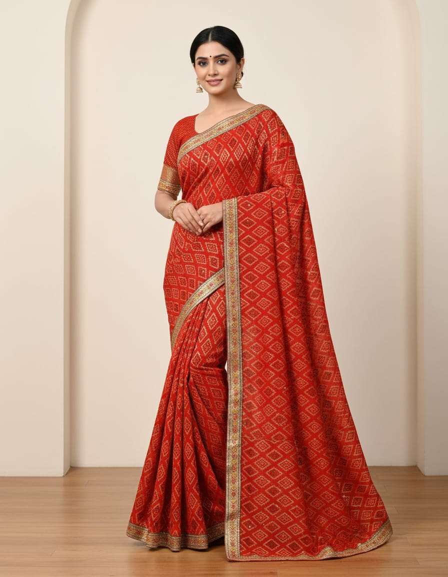 Be the first to review “Multi color full saree lace zomato chiffon fabric saree with fancy gold print on full saree”