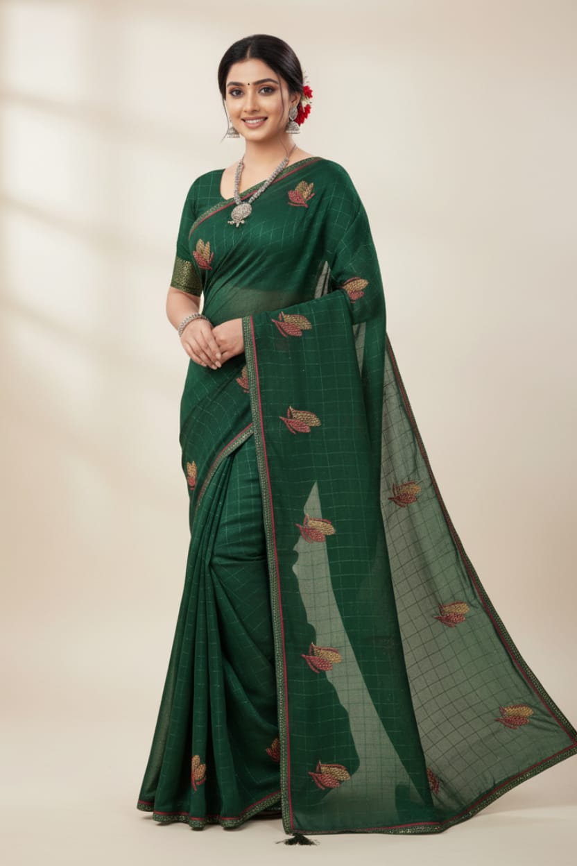 WEIGHT LESS CHECKS FABRIC SAREE WITH CONTRAST RED COLOR VISCOS FABRIC BLOUSE